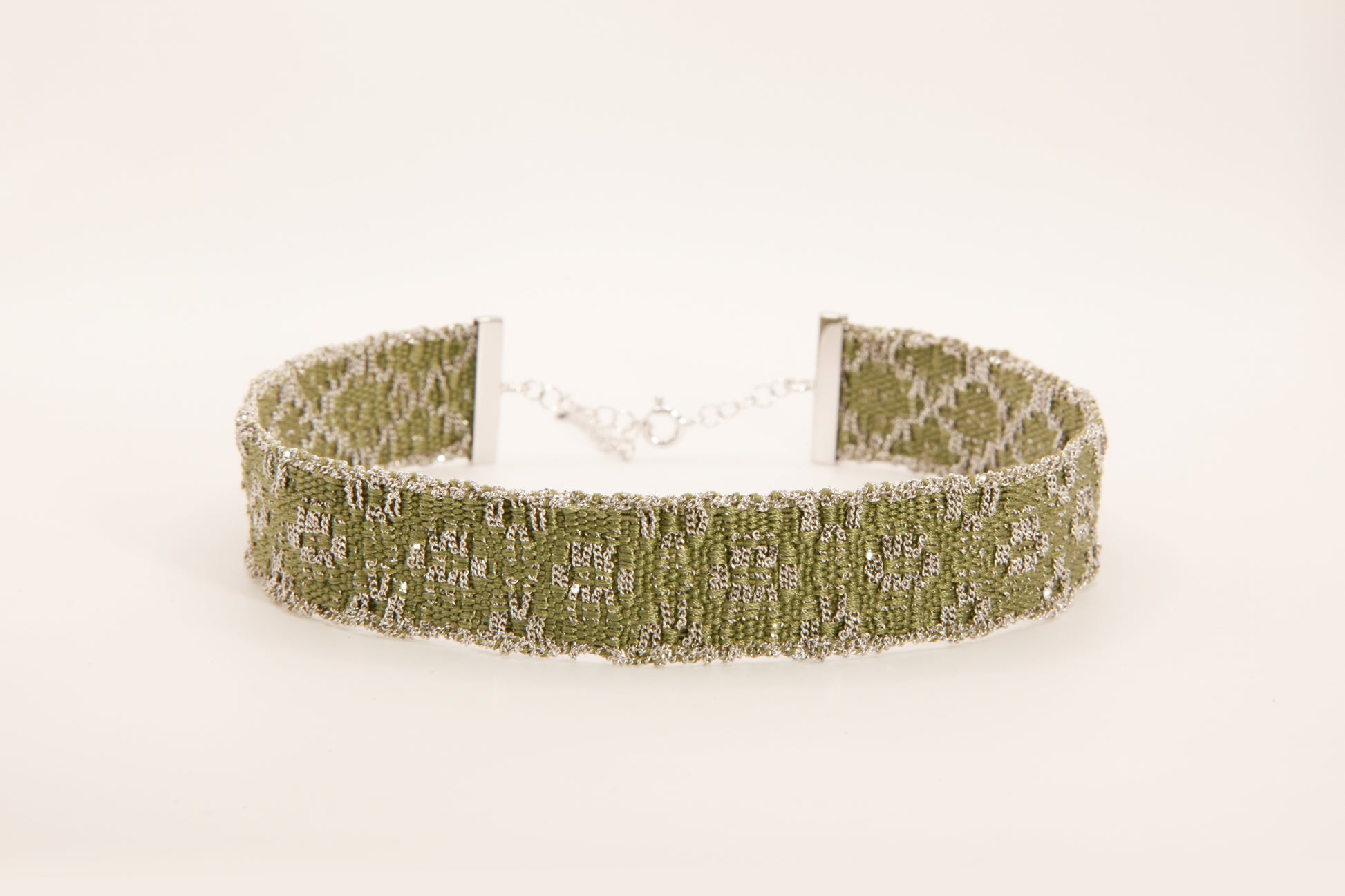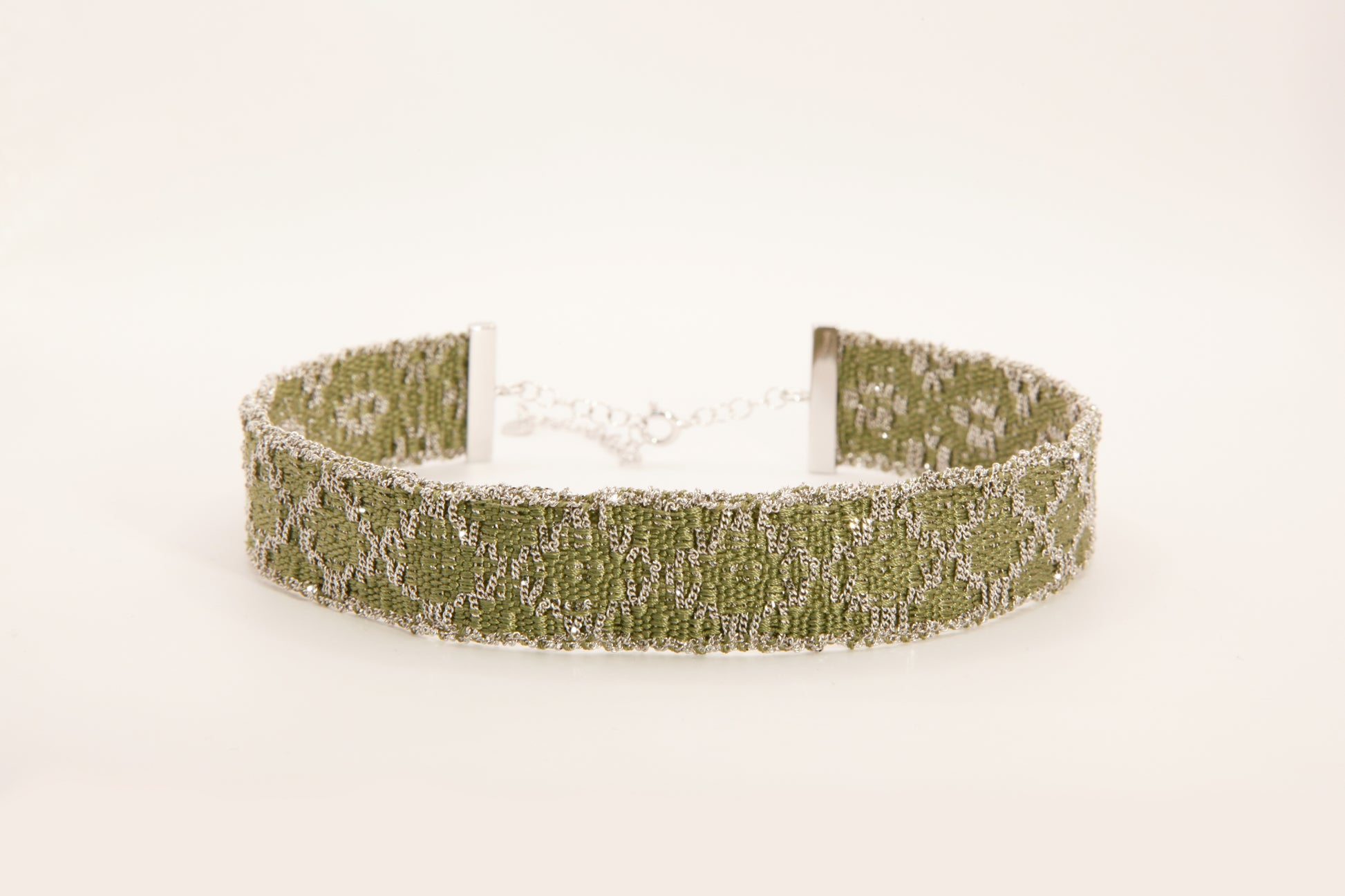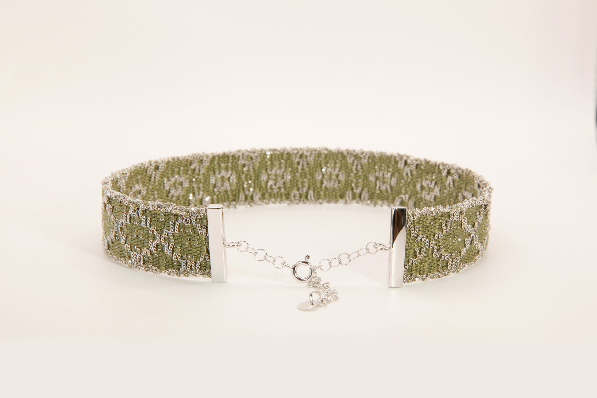 Verwoben mit Seide ummanteltem Garn in Salbeigrün.